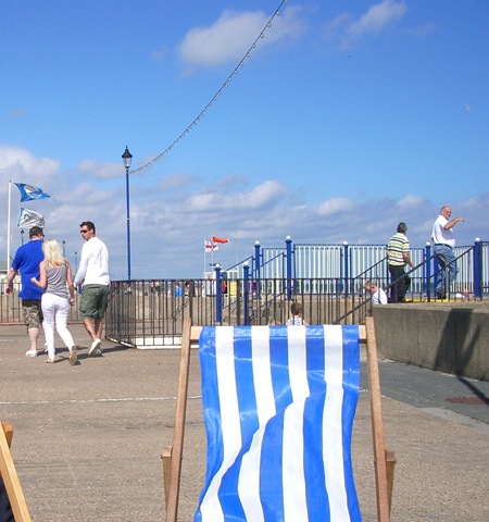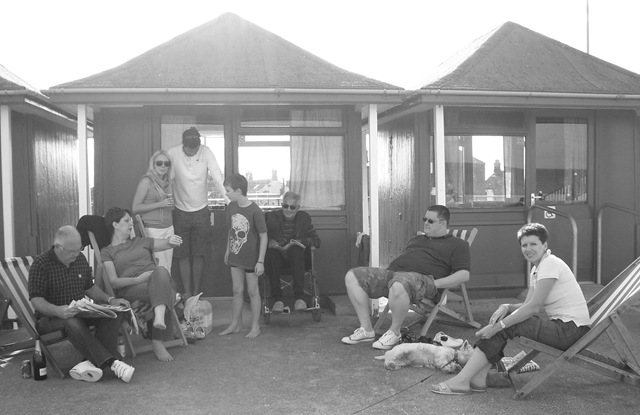 We decided as we had a full house at “Hemingway†for the Bank Holiday Weekend to visit a lovely beach close to our home here in the East Midlands. The weather was fair with plenty of warm sun and a brisk breeze that helped the colourful Kites reach their blustery heights. There were ten of us in all, so plenty of willing hands to push Hamada’s chair along the old fashioned promenade to reach our base for the day at one of the brightly coloured chalets perched high with their watchful eyes, newly painted wood and so many memories of families gone before. They made a stunning border along the seafront.
